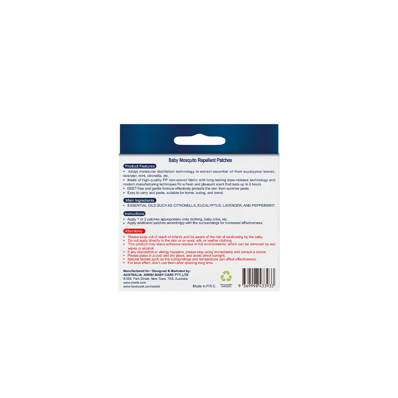 Unit price perAiwibi Baby Mosquito Repellent Patches offer safe and effective protection for your little one. Hypoallergenic and DEET-free, these patches are formulated with natural plant extracts that emit a pleasant scent to repel mosquitoes. With instant effectiveness for the first 8 hours and lasting protection up to 72 hours, they are dermatologically tested for sensitive skin. Made from flexible and breathable non-woven fabric, these patches stay securely in place.